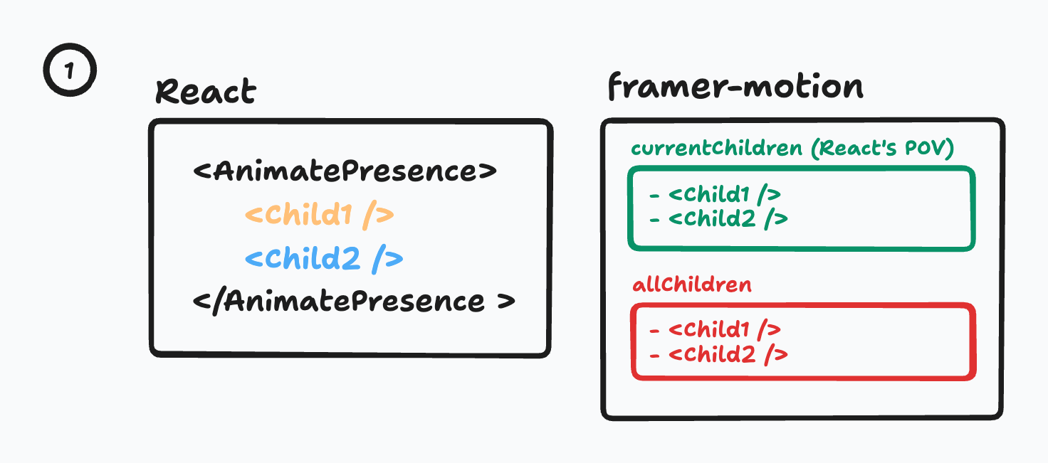 Suppose that we have Child1 and Child2 wrapped within AnimatePresence, and none of them are exiting the DOM yet. Here’s what the above two states like would look in framer-motion: