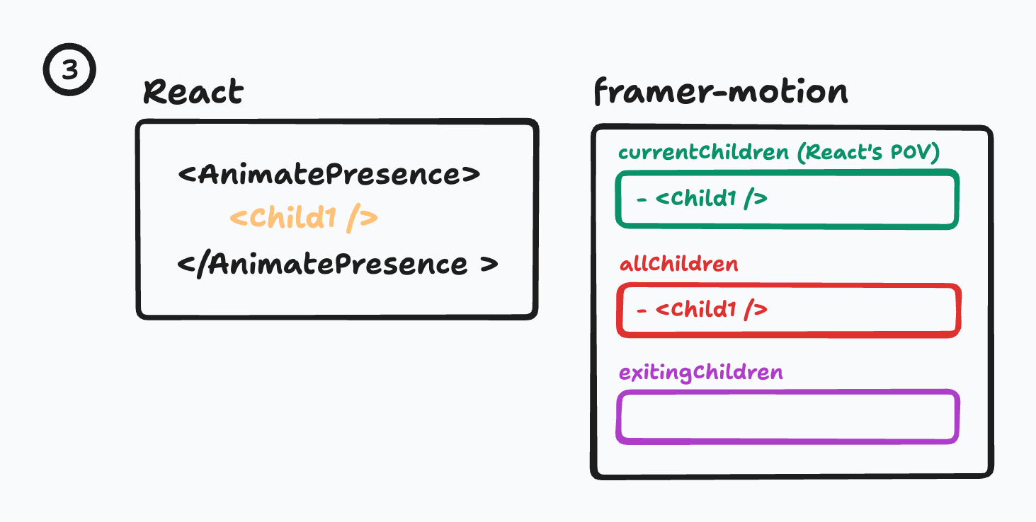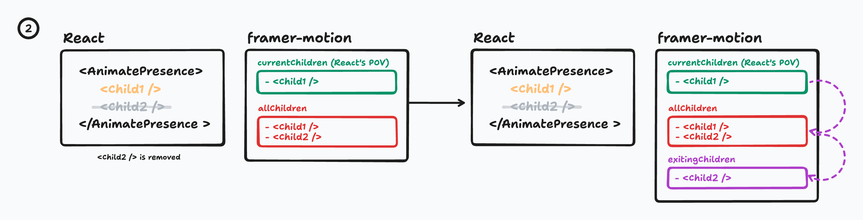 This third state, exitingChildren, is crucial. Firstly, we want to trigger the exit animations once an element is registered as ‘exiting’. Secondly, we want to ensure that this particular element is deleted from AnimatePresence so that we don’t keep unnecessary references to elements that don’t exist in the React tree.